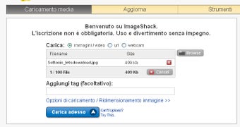 Se vuoi condividere al volo una foto, una comoda opzione è quella di usare ImageShack. Questo rinomato servizio di hosting, in italiano e facile da usare, ti permette di caricare sui server in rete una foto scelta dal tuo PC o tramite URL. Il tutto senza necessità di registrazione. Prima di iniziare l'upload ti sarà data, opzionalmente, la possibilità di ridimensionare l'immagine ad una risoluzione predeterminata (da 100x75 fino a 1600x1200).